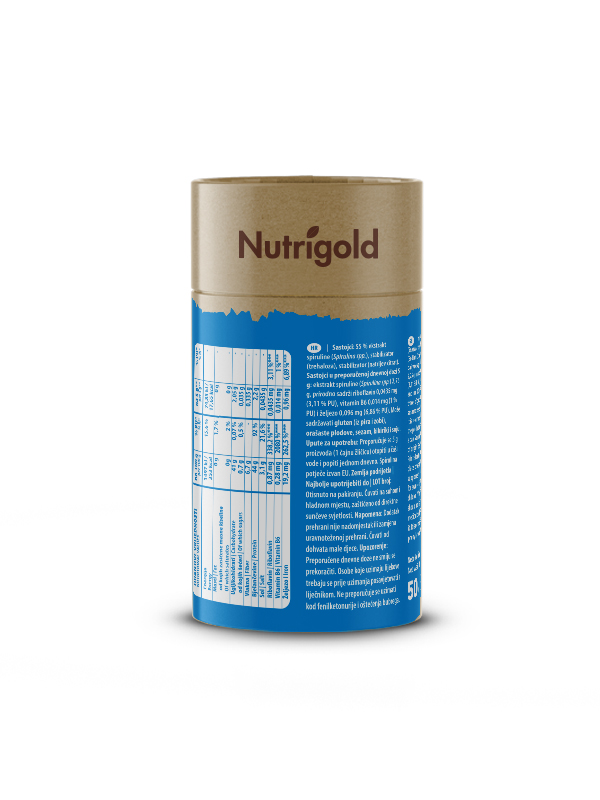 Spirulina-Extrakt (Spirulina spp.) 2,75g, enthält von Natur aus Riboflavin 0,0435mg (3,11% NRV), Vitamin B6 0,014 mg (1% NRV) und Eisen 0,096mg (6,86% NRV)
