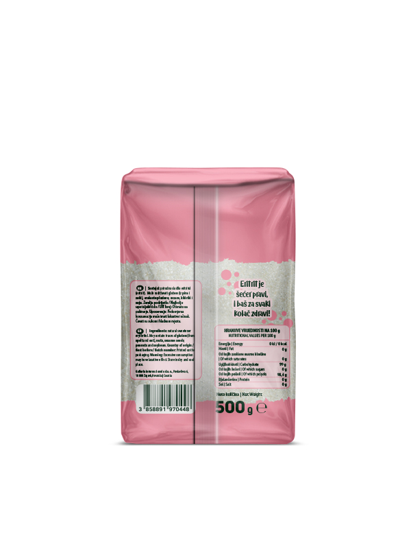 Erythrit ist ein Zuckeralkohol, der durch Fermentation von Zucker aus Mais gewonnen wird und in der Lebensmittelindustrie als Ersatz für Saccharose (Zucker), also zum Süßen, verwendet wird.
