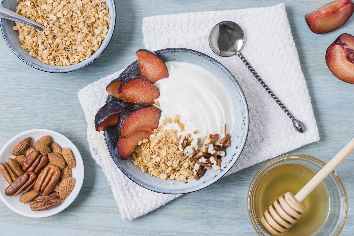 Joghurt ist eine hervorragende Quelle für Proteine und Probiotika. Wählen Sie Naturjoghurt mit reduziertem Zuckergehalt und mischen Sie ihn mit zubereitetem Obst. Etwas Fett ist gut für uns, besonders morgens, also vermeiden Sie Light-Produkte.