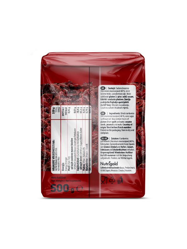 Nutrigold getrocknete Cranberries sind nicht nur gesund, sondern auch unglaublich lecker. Sie können sie einfach pur als Snack genießen oder sie in Müslis, Joghurt, Salaten, Backwaren oder Smoothies einstreuen. Ihre süß-saure Note verleiht Ihren Kreationen eine unvergleichliche Frische und einen Hauch von Exotik.