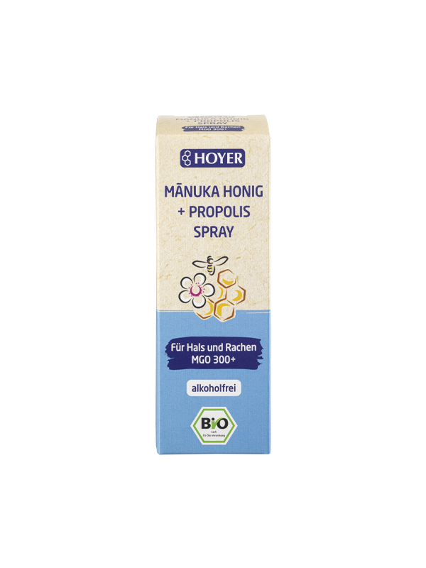 Die Kombination aus Wasser, wunderbarem Manuka Honig (49%) und Propolis Extrakt (5%) macht dieses Spray zu einem wahren Gesundheitselixier. Zusätzlich angereichert mit Grapefruitkernextrakt und Pfefferminzöl ist das Hoyer Spray perfekt für den unbeschwerten Alltag – 100% Bio!