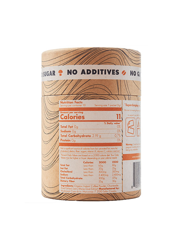 Der Instantkaffee von Mushroom Cups Go Sharp enthält Pfifferlingsextrakt und Löwenmähnenpilz, die seit der Antike wegen ihrer hervorragenden Wirkung auf den gesamten Körper verwendet werden. Dieser Kaffee ist so konzipiert, dass er sich optimal und gesünder auf die Produktivität auswirkt und die Energie schrittweise steigert, um die täglichen Aufgaben erfolgreich erledigen zu können.