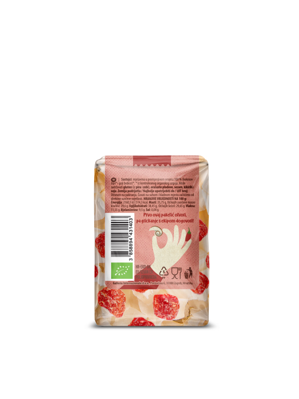 Goji-Beeren sind von süßen Aromen durchdrungen, die an eine Kombination aus köstlichen Cranberry- und Kirscharomen erinnern und perfekt zu den Bio-Kokoschips passen.