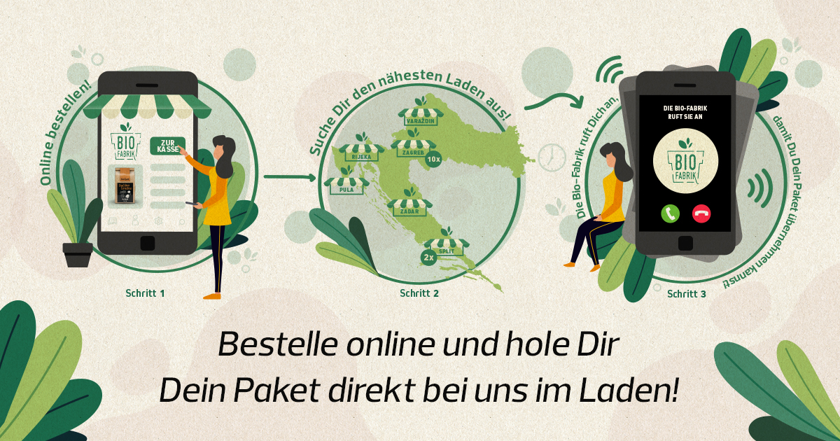 Alles, was Sie tun müssen, ist die gewünschten Produkte im Webshop auszuwählen und im Anschluss zum nächsten Bio-Fabrik Laden zu gehen. Unsere Kolleginnen und Kollegen werden das Paket bei Ihrer Ankunft für Sie bereithalten. ![]()