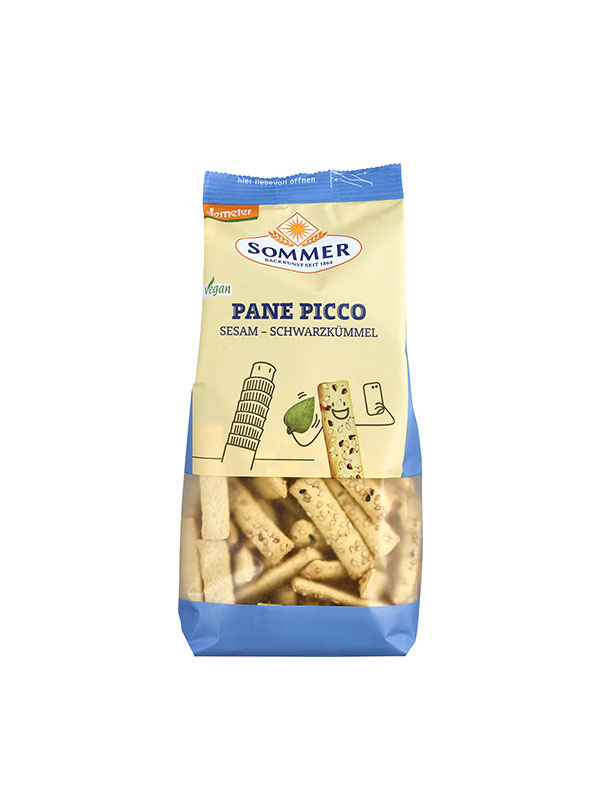 Sommer Pane Picco Kekse aus Dinkel- und Vollkornmehl sind angereichert mit Schwarzkümmel und Sesam aus biologischem Anbau, die in Kombination mit den aromatischen Kräutern der Provence einen perfekten Snack zum Knabbern ergeben.