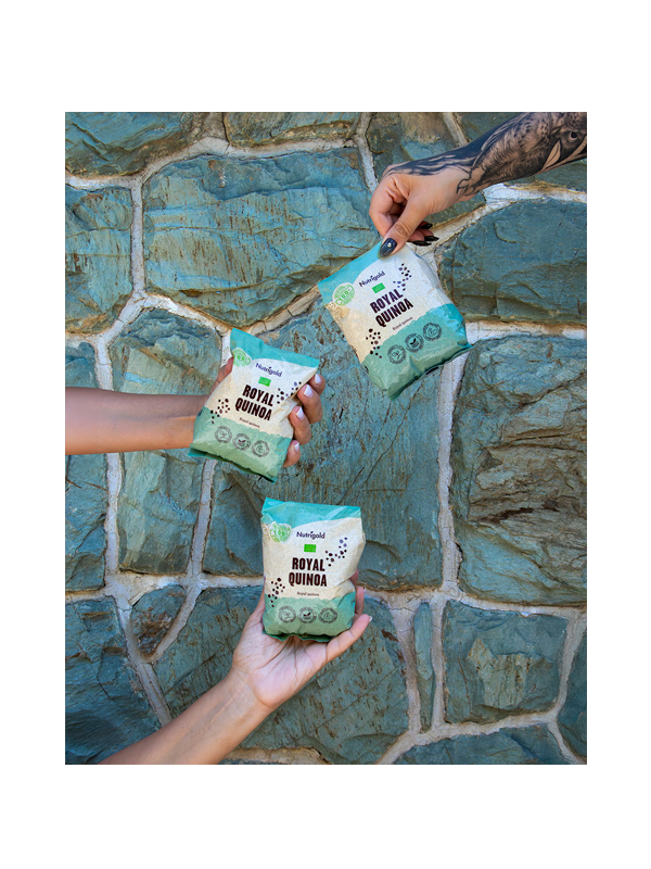 Nutrigold Quinoa Royal zeichnet sich durch höchste Qualität aus, die zu 100 % weiße Quinoa-Samen aus kontrolliert biologischem Anbau enthält.