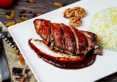 - Mit der restlichen Marinade übergießen, mit Folie abdecken und im vorgeheizten Backofen bei 190°C etwa 45 Minuten backen.