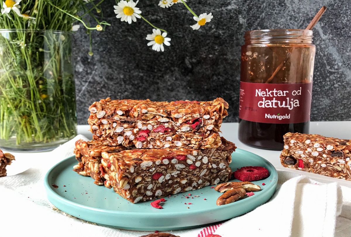 Die Basis dieser knusprigen Energieriegel bilden Datteln bzw. Dattelsirup. Die restlichen Zutaten können Sie ganz nach Geschmack variieren oder einfach diesem Rezept folgen. Es lohnt sich!