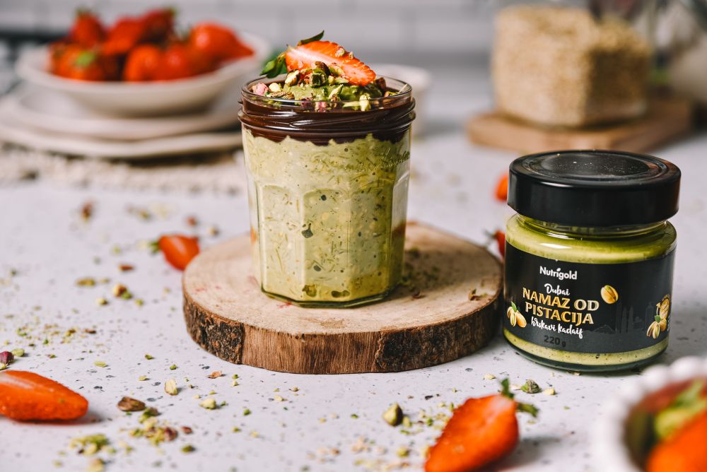 Er ist exotisch, cremig und mit dunkler Schokolade, Pistazien-Kadaif-Aufstrich und frischen Erdbeeren verfeinert – eine perfekte Kombination aus orientalischem Flair und nährstoffreichen Zutaten.