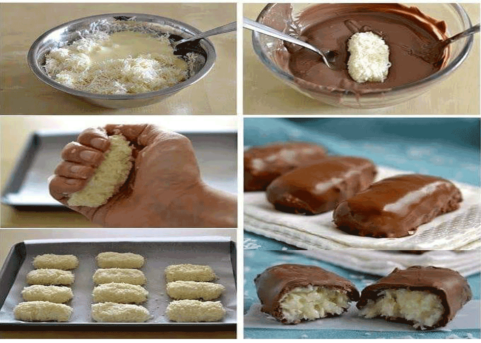 - Anschließend mit angefeuchteten Händen längliche Fladen in der Form eines gekauften Bounty aus der Kokosnuss-Mischung formen.