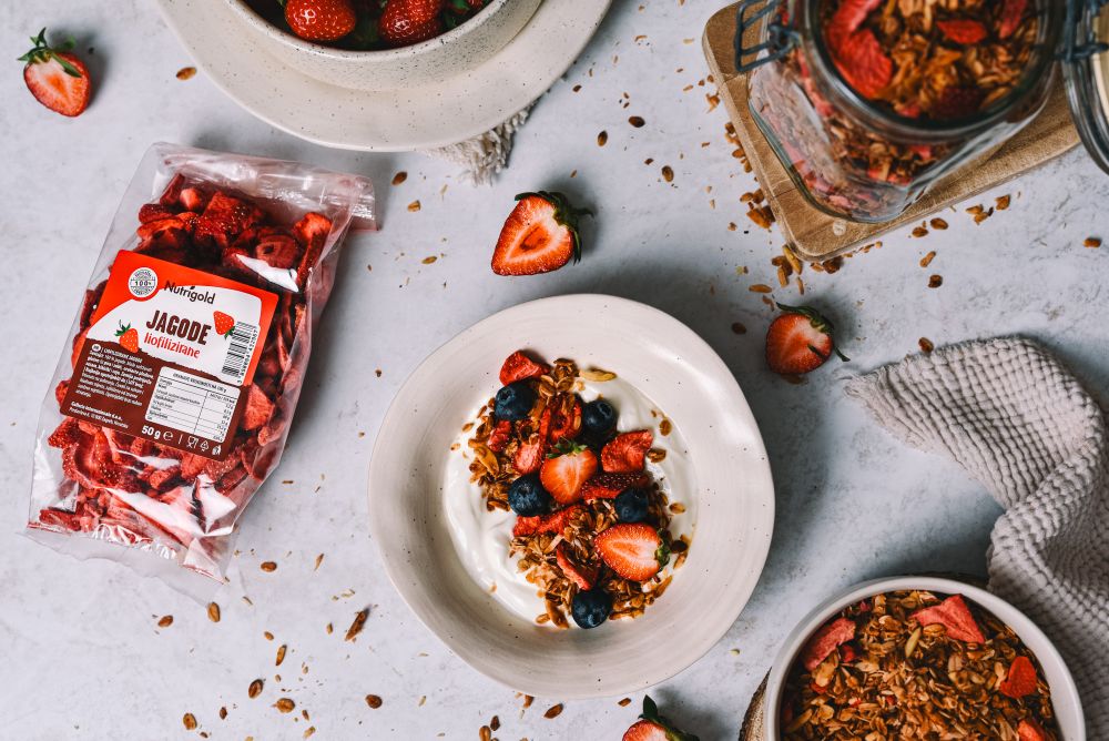 Dieses hausgemachte Granola vereint perfekt geröstete Haferflocken und knackige Mandeln mit einem unwiderstehlichen Vanillearoma. Verfeinert wird es mit Ahornsirup und Kokosöl. Die Kokosnuss verleiht ihm eine tropische Note, während die gefriergetrockneten Erdbeeren für fruchtige Frische und eine leichte Säure sorgen, die die Süße perfekt ausbalanciert.