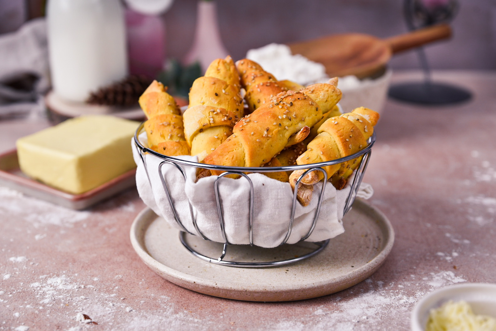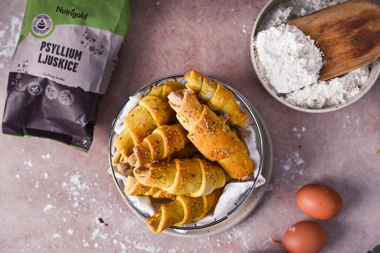 Locker, weich, warm und herrlich duftend – genau so werden die Hörnchen, die Sie mit Reismehl und Flohsamenschalen zubereiten können,! Mit Sesam, Butter, einem Ei, Milch, Hefe und Rohrzucker entsteht ein besonders zartes und aromatisches Gebäck.