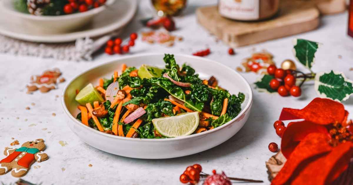 Das satte Grün des krausen Grünkohls, die erfrischend saftige und knackige Karotte sowie die gerösteten Cashewkerne verbinden sich zu einem Genuss, der Ihren Gaumen regelrecht tanzen lässt. Einen entscheidenden Beitrag leistet auch das Dressing. Eine Kombination aus Erdnussbutter, Tamari, Kokoszucker, Limetten- und Ananassaft sowie weiteren ausdrucksstarken Zutaten führt Sie für einen Moment aus dem gewohnten Festtagsmodus heraus.
