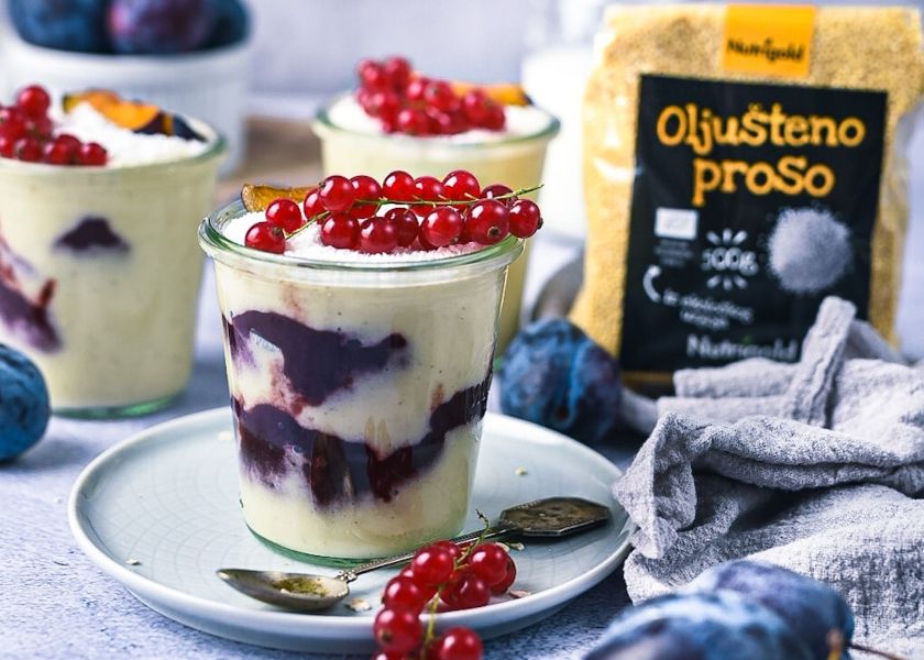 3. Servieren Sie in Schälchen schichtweise: eine Schicht Hirsepudding, dann eine Schicht Pflaumenmarmelade.