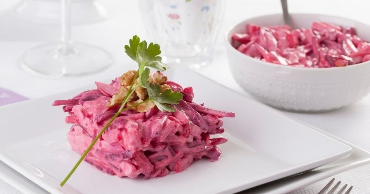 Die Hauptzutat dieses berühmten rosa Salats ist Rote Bete, ein äußerst gesundes Wurzelgemüse. Sie ist leicht verdaulich, mineralstoffreich und in Kombination mit einem Apfel ergibt sie den saftigsten Salat überhaupt.