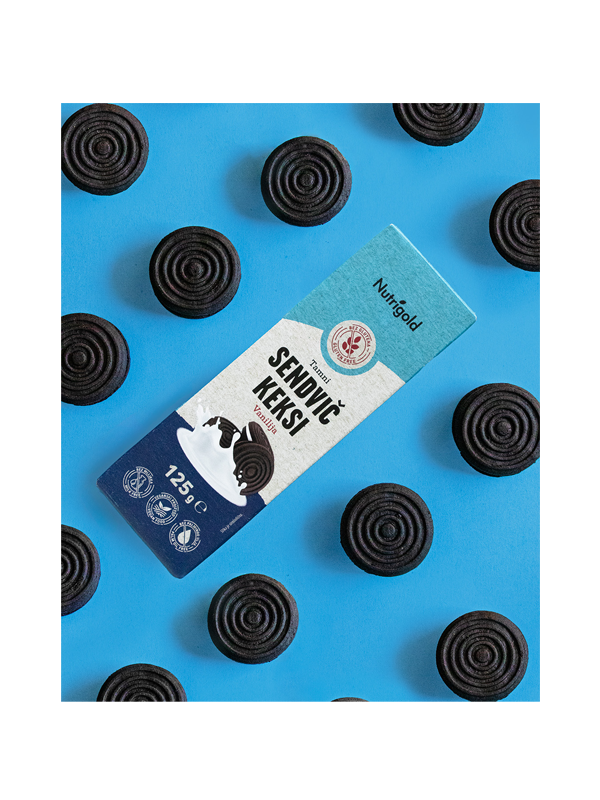 Wählen Sie für Sie und Ihre Lieben die unwiderstehlich süße Nutrigold-Variante und erfreuen Sie Ihren Gaumen mit dunklen Sandwichkeksen gefüllt mit Vanille!