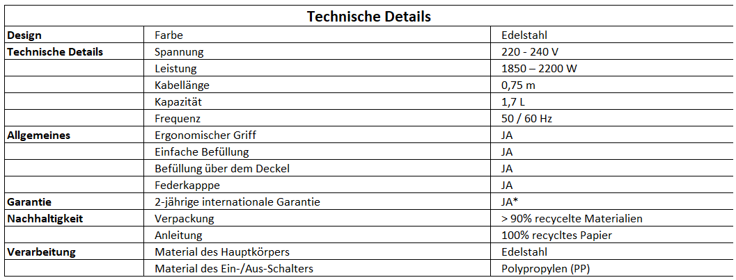 - Ein verstecktes Heizelement aus Edelstahl sorgt für schnelles Kochen und einfache Reinigung