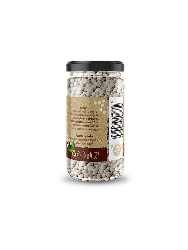 Nutrigold 100% biologischer weißer Pfeffer wird mit einer speziellen Technik hergestellt, bei der er nach der vollständigen Reifung getrocknet und in Wasser eingeweicht wird, um die äußere, dunkle Membran zu entfernen. Durch dieses Verfahren erhält weißer Pfeffer seine charakteristische weiße Farbe und ein etwas milderes Aroma, da die äußere Membran ätherische Öle enthält, die für seine Schärfe verantwortlich sind. Weiße Pfefferkörner sind bei der Zubereitung leichterer Gerichte unverzichtbar, können aber vielfältig eingesetzt werden. Er passt perfekt zu verschiedenen Gerichten und ist eine ausgezeichnete Wahl für alle, die in ihren Gerichten eine etwas schwächere Schärfe als die des schwarzen Pfeffers wünschen. Weißer Pfeffer passt gut zu Gewürzen wie Basilikum, Kurkuma, Nelken und Knoblauch.