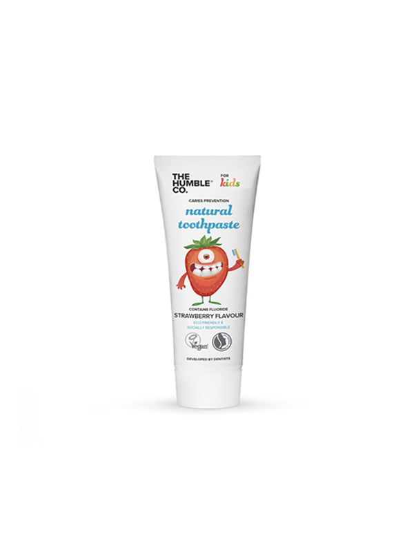 Lernen Sie die Humble Brush Zahnpasta für Kinder mit Erdbeergeschmack kennen, hergestellt aus natürlichen Inhaltsstoffen, ohne SLS. Es enthält Natriumfluorid und wird in Tuben aus recycelten Materialien geliefert.